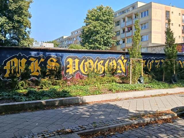 Słabiej widoczny poprzez bujną roślinność mural w centrum miasta.