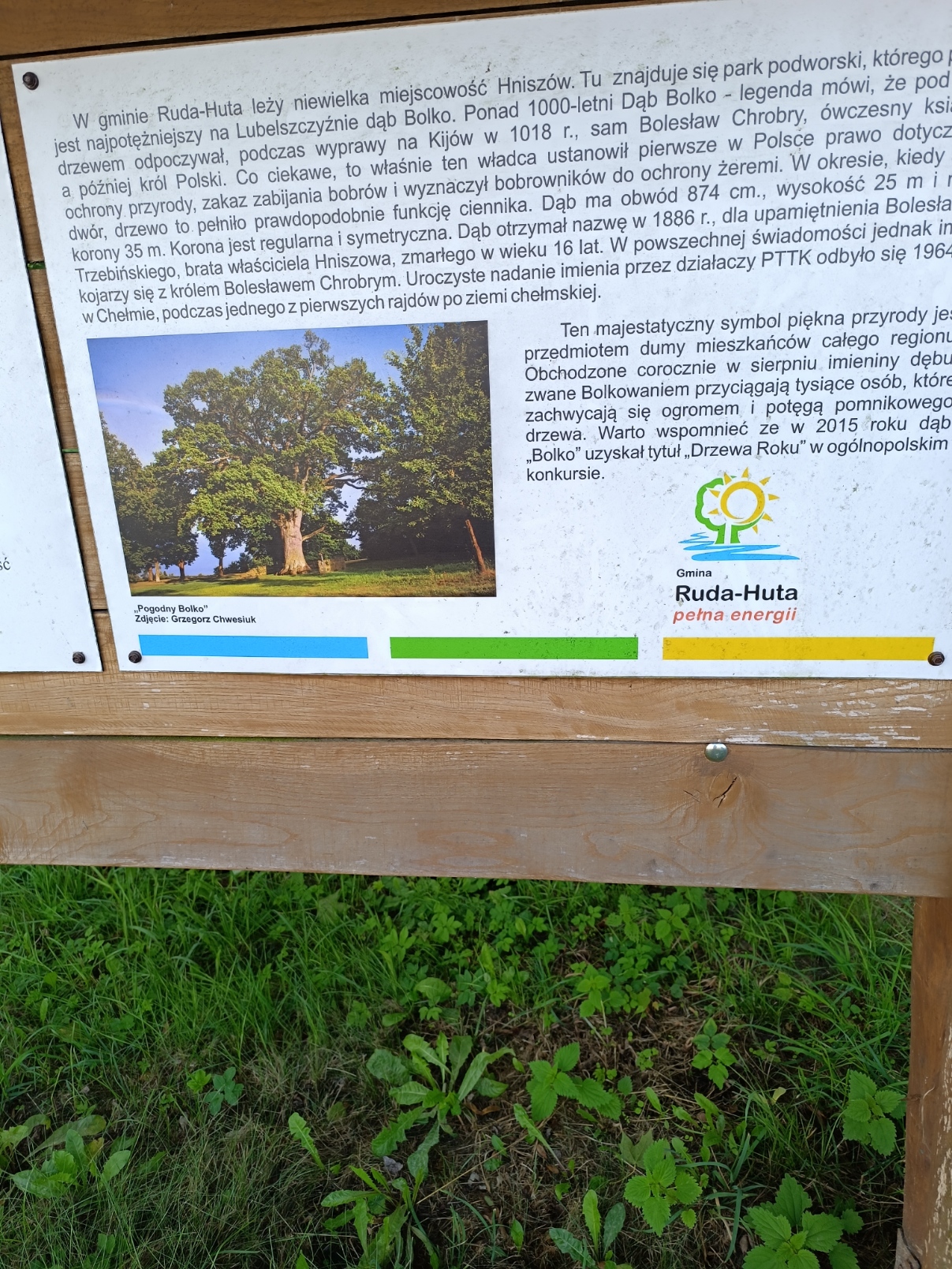 Po dworsko-parkowym zespole Karpińskich w nadbużańskim Hniszowie pozostała część parku z kilkuset drzewami, w tym kilkanaście drzew pomnikowych, m.in. dęby szypułkowe (z Bolkiem jest ich sześć), a także jesion wyniosły, iglicznia trójcierniowa, brzoza brodawkowata. Pomnikowe okazy można zobaczyć wybierając się na spacer ścieżką przyrodniczo-historyczną „Bolko” (1,2 km, ok. 0,5 godz.). Na trasie spaceru jest też dawny staw dworski w starorzeczu Bugu, otoczony szuwarami, a z niektórych miejsc ścieżki można oglądać szerokie panoramy nadbużańskiej doliny. Latem w parku organizowany jest sportowo-rekreacyjny festyn „Bolkowanie w Hniszowie”, połączony z kulinarnym konkursem i kiermaszem „Nadbużańska Akademia Smaku”. W trakcie festynu odbywały się też spływy kajakowe rzeką Uherką , jednym z dopływów Bugu. Aktualnie rzeka Bug nie jest aktywna turystycznie.
