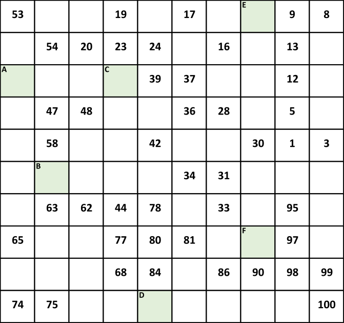 Uzupełnij brakujące liczby tak aby możnabyło narysować linię (węża), która przechodzi kolejno przez wszystkie liczby od 1 do 100. Z jednej liczby do drugiej można przechodzić poziomo, pionowo albo na ukos tylko do najbliższej kratki.