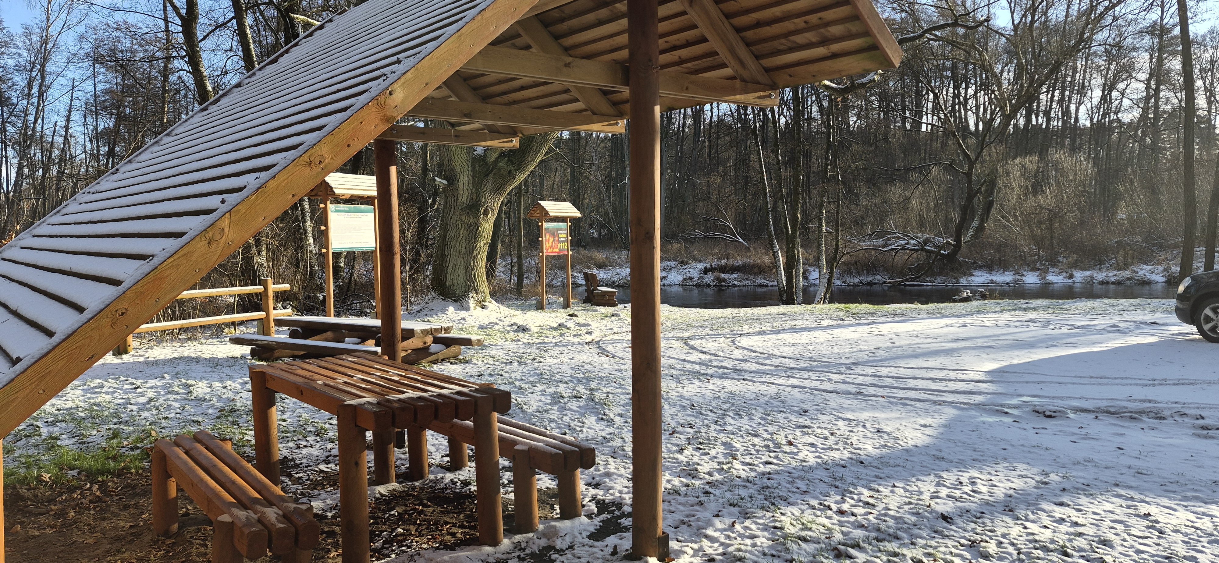 Parking zawiera standardową na owe czasy infrastrukturę: a więc wiaty i miejsca do biwakowania. Ale ma też coś, czego nie mają inne leśne parkingi, czyli bezpośredni dostęp do rzeki Regi w jej środkowym biegu. Jest nawet ławeczka z której można kontemplować z bliska piękno tej jeszcze dzikiej rzeki. Miejsce wydaje się też idealne do spławiania kajaków czy podobnych wodnych środków lokomocji. Warto również udać się dalej w kierunku Łagiewnik(ów). Kilkaset metrów po przekroczeniu mostu przy drodze rosną piękne wiekowe dęby.