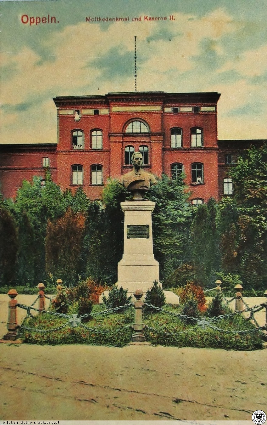 Pomnik Helmutha von Moltkego odsłonięto w trakcie święta 63. pułku piechoty - 30 listopada 1899 roku. Jego podstawę stanowił granitowy cokół, na którym ustawiono ponad metrowe popiersie. Pomnik ustawiono przy deptaku, jaki ciągnął się wzdłuż koszar przy dzisiejszej ul.Ozimskiej. Helmuth Moltke to pruski generał i feldmarszałek, który odegrał czołową rolę w reformacji ówczesnej armii oraz stworzeniu nowoczesnej taktyki operacyjnej wojska. Pomnik w Opolu odsłonił bratanek upamiętnionego, Friedrich von Moltke - ówczesny prezydent rejencji opolskiej. Na kilka tygodni monument zniknął ze swojej lokalizacji w trakcie plebiscytu, kiedy to otaczające go barierki zostały uszkodzone przez stacjonujące w koszar wojsko francuskie. Los pomnik Moltkego nie jest znany. Prawdopodobnie został zdemontowany jeszcze przed wkroczeniem do miasta Armii Czerwonej.