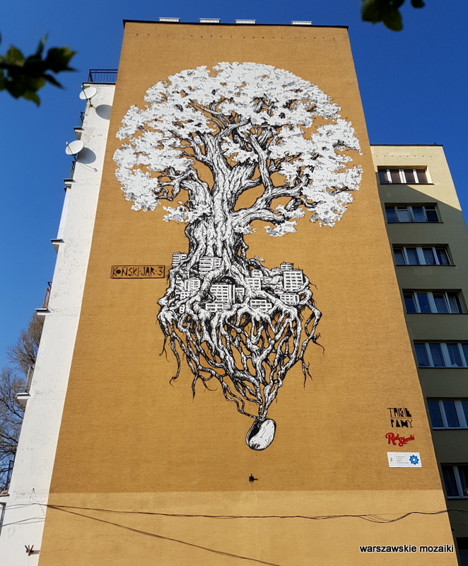 "Mural zajmuje prawie całą wysokość 7-piętrowego budynku. Przedstawia czarno-białe drzewo, którego korzenie wyrastają z fasolki i oplatają osiedle typowych ursynowskich bloków. Następnie drzewo przechodzi w konary i w białą koronę. Obok niego znajduje się namalowany adres budynku (Koński Jar 3).