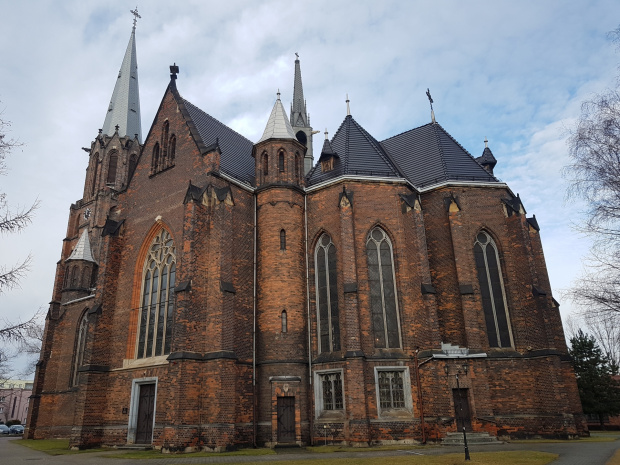Świątynia powstała w konstrukcji murowanej, z cegły i kamienia, jest częściowo otynkowana i posiada kamienne elementy wykończeniowe i ozdobne. Elewacje zewnętrzne operują detalem o charakterze neogotyckim, zastosowane zostały wimpergi z trójlistnym maswerkiem, wydłużone, zamknięte łukiem ostrym okna, smukłe przypory czy dekorujące wieże kwiatony.