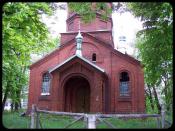 "Cerkiew prawosławna Świętej Trójcy od 1946 r. do niedawna użytkowana jako magazyn. Obecnie cerkiew filialna parafii w Chełmie . Wzniesiona w stylu bizantyjsko-ruskim, w 1909 r. z czerwonej cegły na zróżnicowanym rzucie, zbliżonym do prostokąta z zakończonym oktagonalnie prezbiterium. Na elewacjach zewnętrznych medaliony z wizerunkami świętych prawosławnych. Obramienia okienne z motywami roślinnymi i geometrycznymi. "