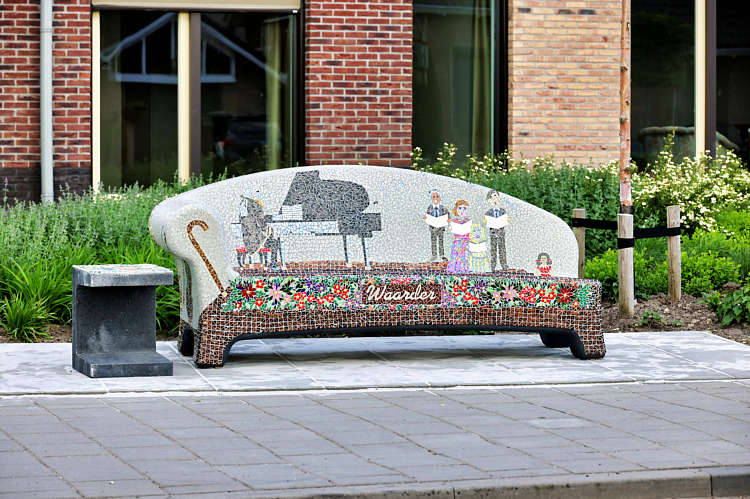 On Saturday afternoon, May 5, 2025, the second mosaic bench in Waarder was unveiled. This bench, located in front of the Amadeus House, features a music-inspired design.