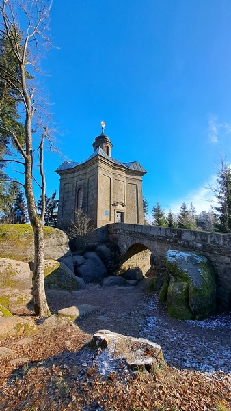 Budowla stoi na skalnej krawędzi obrywu wzniesienia Hvězda, na wysokości 674 m n.p.m. Została zbudowana w 1733 przez Othmara Zinkego, opata klasztoru benedyktynów w Broumovie, według projektu K. I. Dienzehofera. W 1787 na polecenie cesarza Józefa II, w związku z reformami józefińskimi, kaplicę zamknięto z zamiarem jej sprzedania lub zburzenia. Wobec braku zainteresowania kupnem zaczęła stopniowo popadać w ruinę tak, że zostały z niej jedynie fundamenty do wysokości okien i drzwi oraz mostek łączący skały. W latach 50. XIX wieku na górze przebywał opat Jan Nepomucen Rotter, który widząc ruiny kaplicy postanowił ją odbudować. Dzięki wieloletnim staraniom kaplicę odbudowano w stylu barokowym. W 1855 odbyło się jej poświęcenie. Mury wykonano z piaskowca ciosowego, na rzucie pięcioramiennej gwiazdy, której ramiona zakończone stożkowymi daszkami zwieńczono dachem w kształcie kopuły z okrągłą wieżyczką zakończoną gwiazdą. Architektonicznie kaplicę wkomponowano w skalne otoczenie, z którym idealnie harmonizuje.