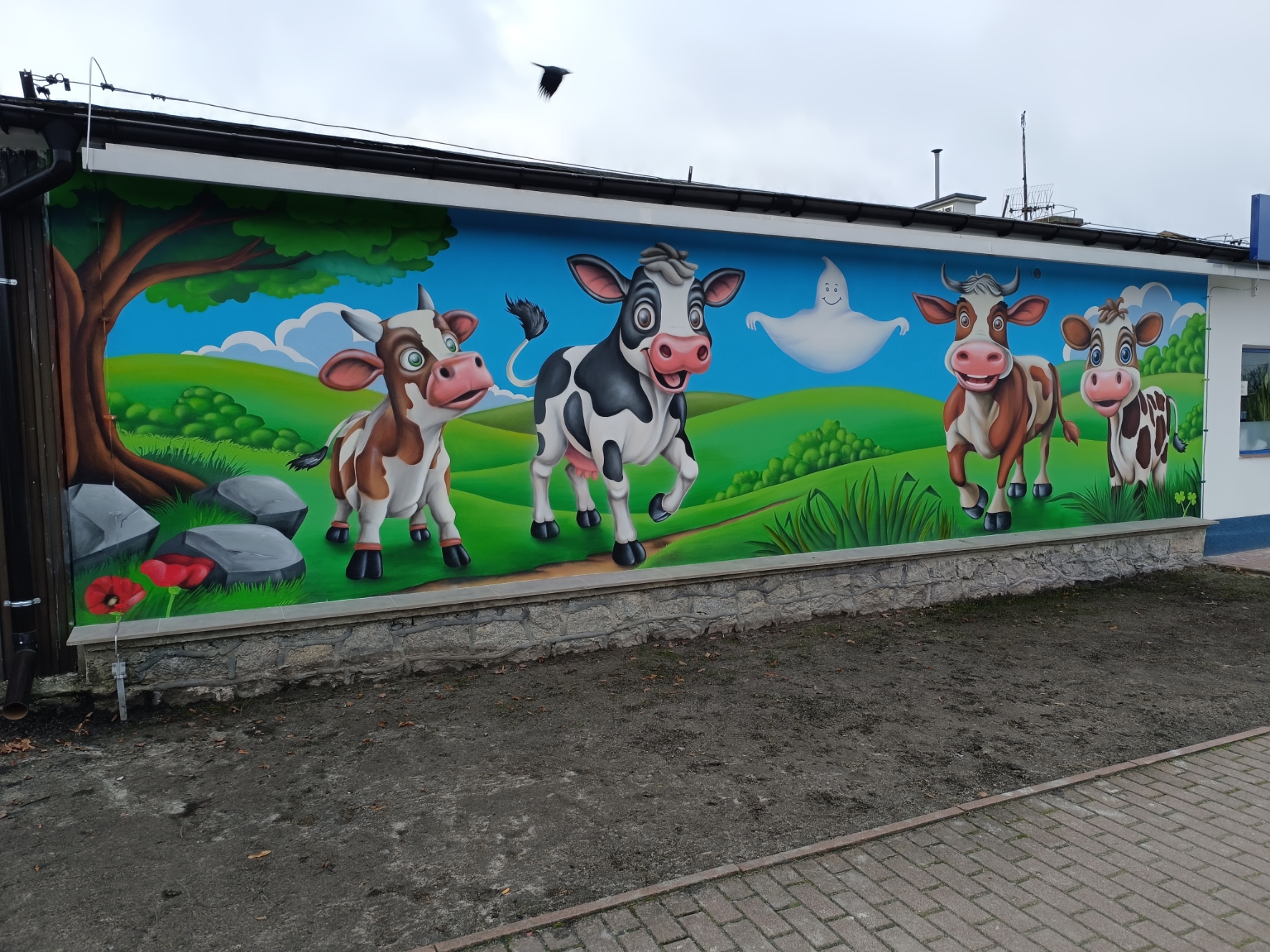 Mural ściany budynku portierni Spółdzielni Mleczarskiej Bieluch w Chełmie. Na muralu występuje duszek Bieluch i łąka, na której pasą się krówki. Krówki to także firmowe cukierki mleczarni, wytwarzane z mleka w proszku, które produkują Spółdzielnia.