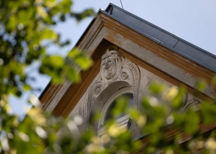 Stań przodem do wyimka - są dwa takie same. Skrzynki szukaj mniej więcej w połowie płotu (dokładnie na wysokości płotu - spoiler zdjęciowy - dzielącego na dwie części ogródek kamienicy) pod treflem.