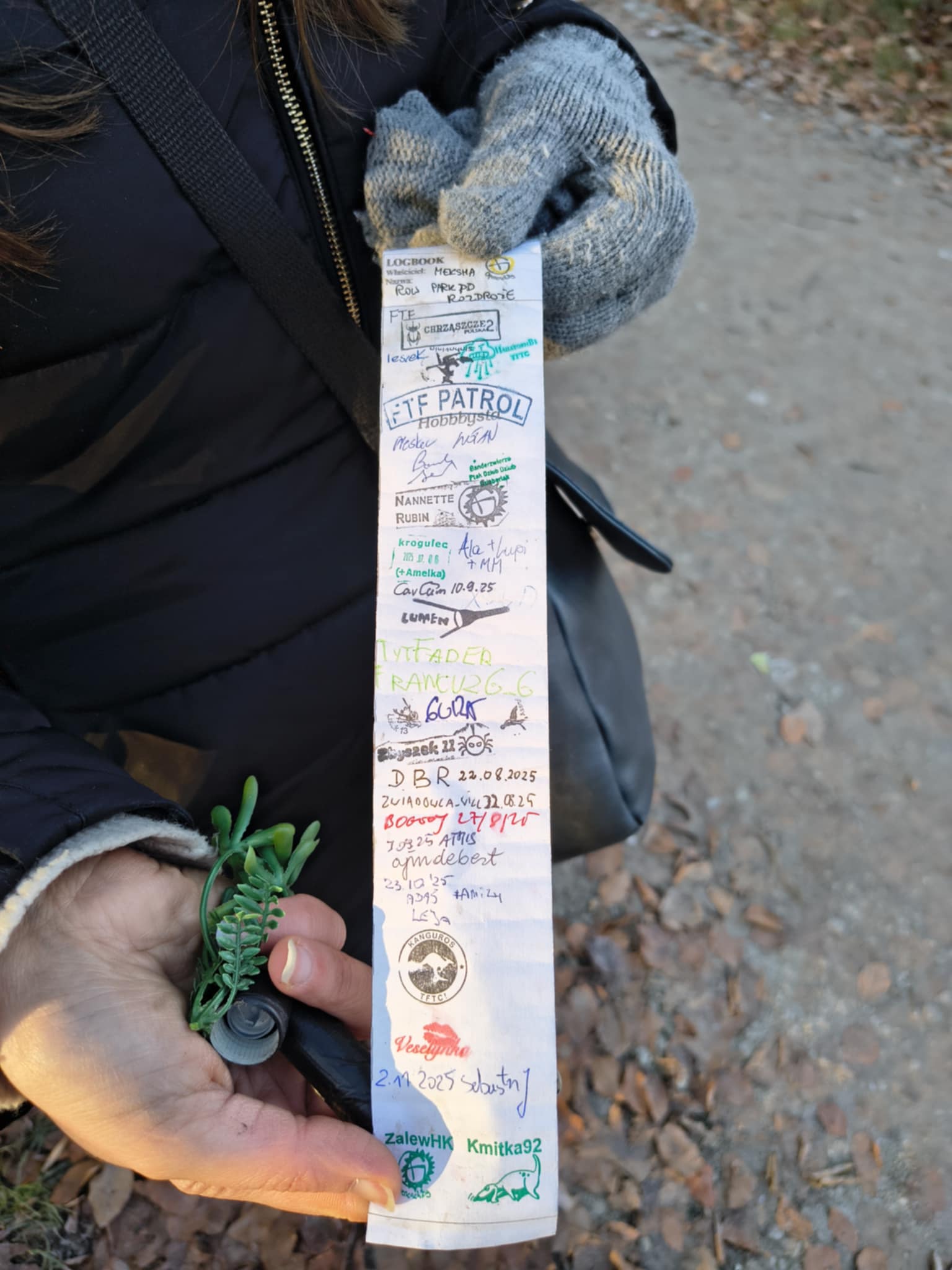 Zaliczona podczas rodzinnego spacerku w Parku Południowym. Liście trochę utrudniają namierzenie pojemnika. Trochę grzebania i się udało namierzyć skubańca. W parku piękna złot jesień panuje. Dzięki, pozdrawiam.