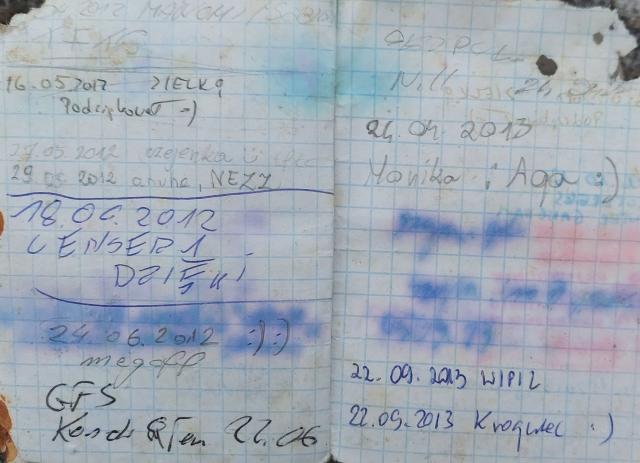 Skrzyneczka znaleziona za kolejnym podejściem - poprzednio poszukiwania były utrudnione przez biwakujących w pobliżu:).