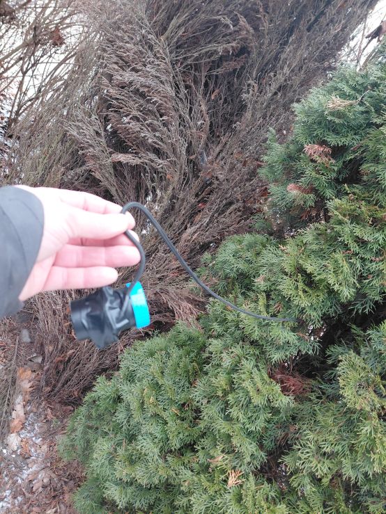 Zostawiamy mikro przyczepione do sznurka, sznurek przyczepiony do tui, tuja zielona, obok szarej zwiędłej i to wszystko na kordach. Chyba wszystko jasne :-)