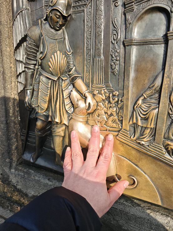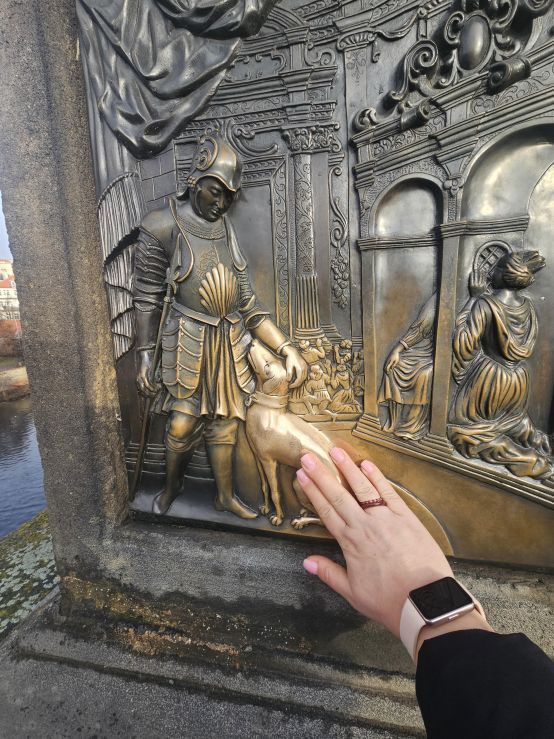 Może to nie był najlepszy pomysł, żeby akurat dzisiaj tu przyjść. Na moście było tylu turystów, jakich rzadko widzieliśmy w innych miastach. Przy Janie Nepomucenie i jego psie musieliśmy stanąć w kolejce, bo również geocaching.com ma tutaj wirtualną skrytkę. Ale w końcu udało nam się pogłaskać błyszczącego psa.