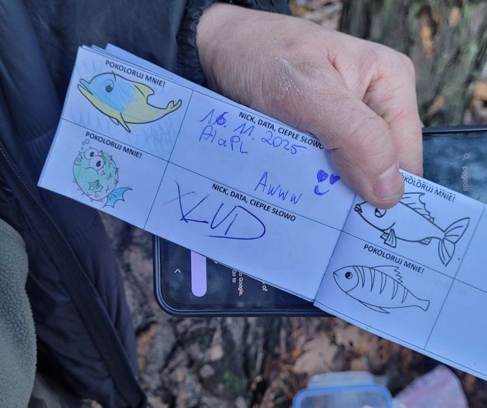 Nadszedł wreszcie czas na wielki finał wędkarskiej przygody;) keszyk podejmowany w pośpiechu, bo w tym momencie już wiedzieliśmy, że czeka nas wykręcanie życiówki w drodze powrotnej by zdążyć na pociąg. Na szczęście skrzyneczka znaleziona bezproblemowo, a i pociąg udało się dogonić. Wpisaliśmy się według zaleceń ownerki;) dzięki za kesza i całą serię!